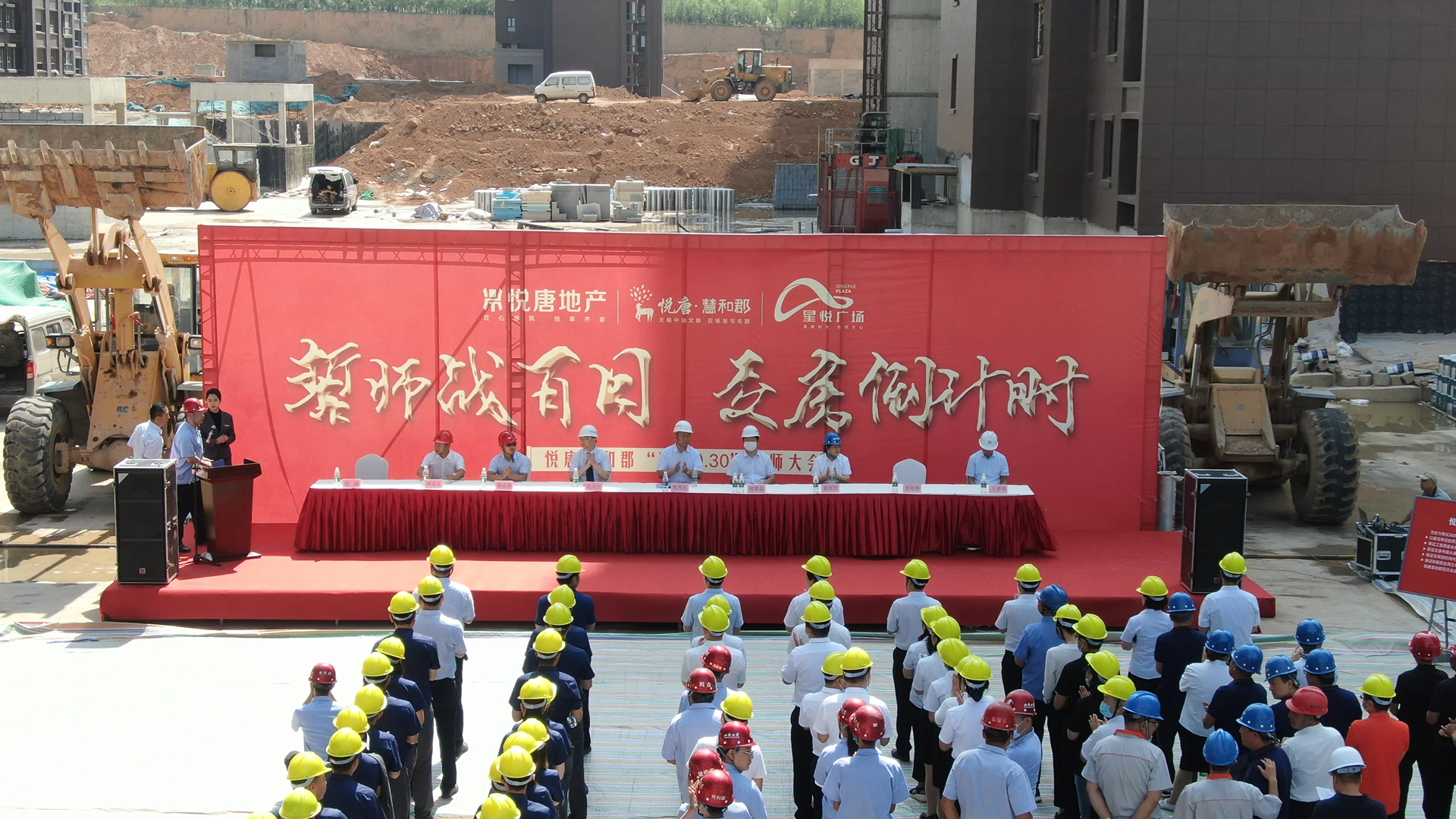 觀摩結(jié)束,全體人員行至主會場,只見主席臺上“誓師戰(zhàn)百日、交房倒計時”鎏金大字磅礴而現(xiàn),兩側(cè)裝載機猶如雄獅俯臥、旌旗招展颯颯威武!全體人員就位,工程百日會戰(zhàn)誓師大會正式拉開帷幕!